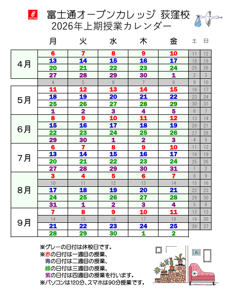 決まった曜日・お時間にお通いいただくコースです。 コースによって講座内容・曜日・時間が異なりますので、詳細はお問い合わせください。資料の郵送も承ります。 今期は4月から新学期が始まり、9月までのスケジュールとなっています。 途中入会も可能です。都合により変更する場合があります。